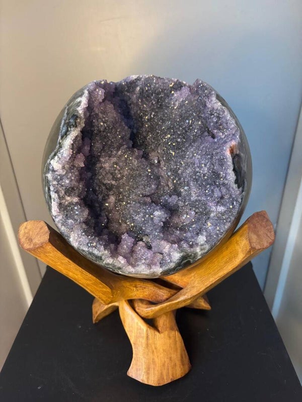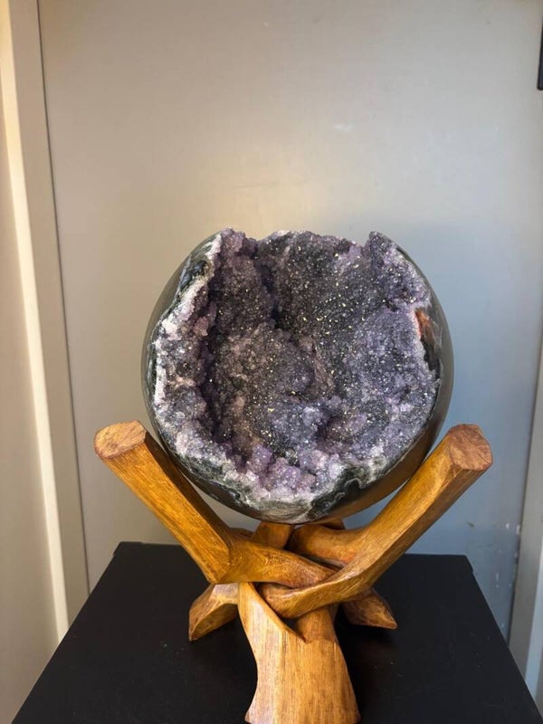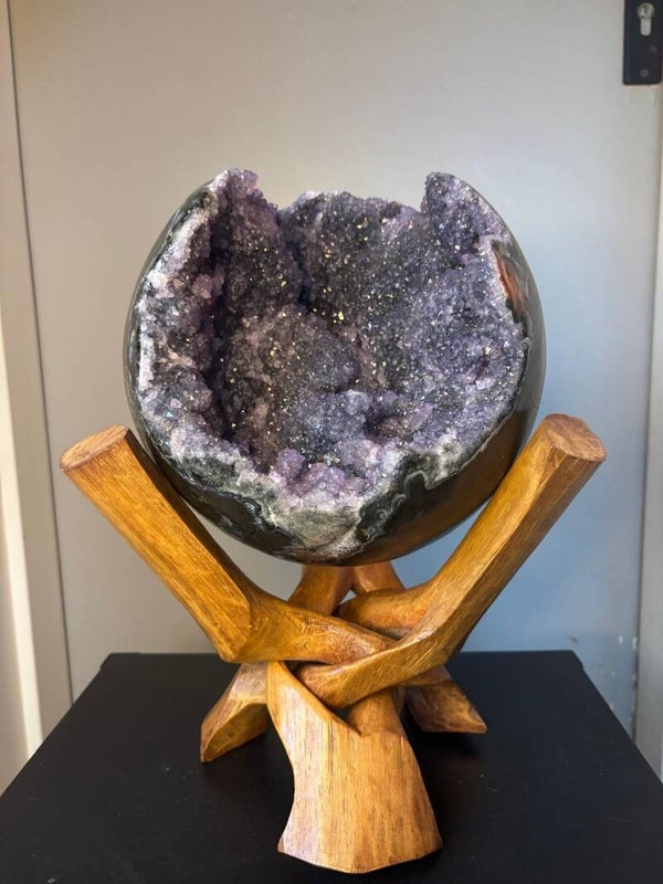 Breng balans, rust en schoonheid in je omgeving met deze amethist bol van 9,1 kg op houten standaard. Een tijdloos stuk dat zowel esthetisch als energetisch een waardevolle aanvulling is op je interieur.