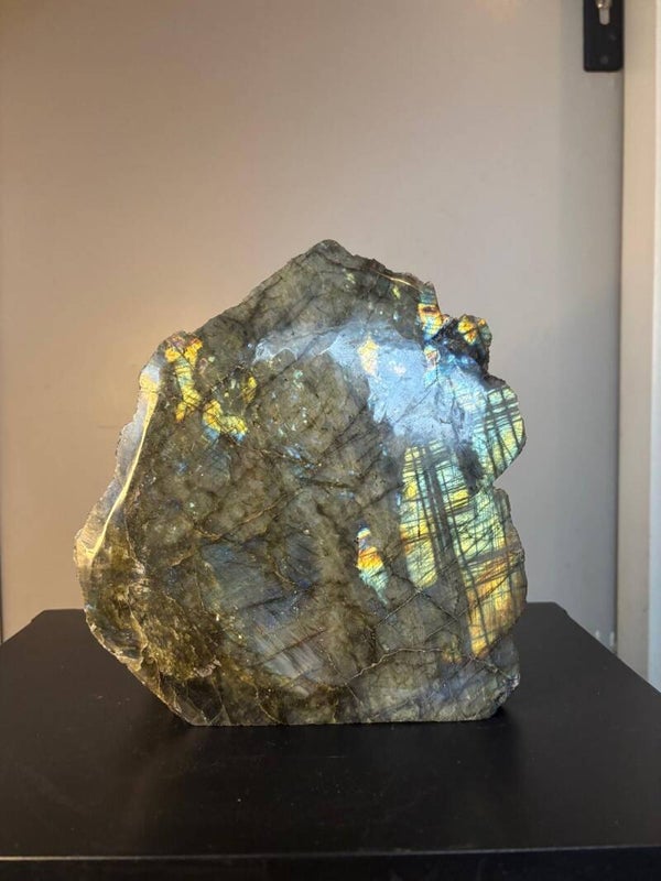 Breng de betoverende energie van labradoriet in je ruimte met dit prachtige labradoriet stuk, voorzien van een schitterende blauwe flash. Labradoriet staat bekend om zijn mystieke uitstraling en wordt vaak geassocieerd met magie, bescherming en intuïtie. De hypnotiserende blauwe flash, die zich ontvouwt bij het vangen van licht, maakt dit stuk niet alleen een visueel pronkstuk, maar ook een krachtige energetische toevoeging aan je huis of meditatieplek.
