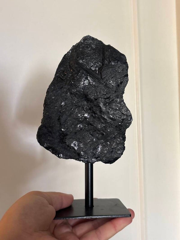 Deze ruwe zwarte toermalijn op standaard is niet alleen een krachtige energetische beschermer, maar ook een stijlvol en betekenisvol decoratiestuk.