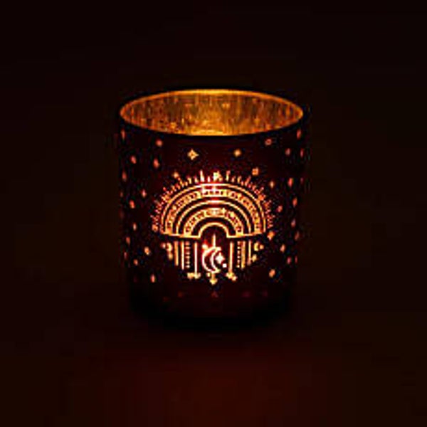 Dit unieke sfeerlicht van glas is uitgevoerd in een betoverende metallic lila kleur en versierd met een afbeelding van een regenboog, maan en sterretjes. Het elegante design straalt rust, magie en spiritualiteit uit, waardoor het een bijzondere toevoeging is aan ieder interieur.