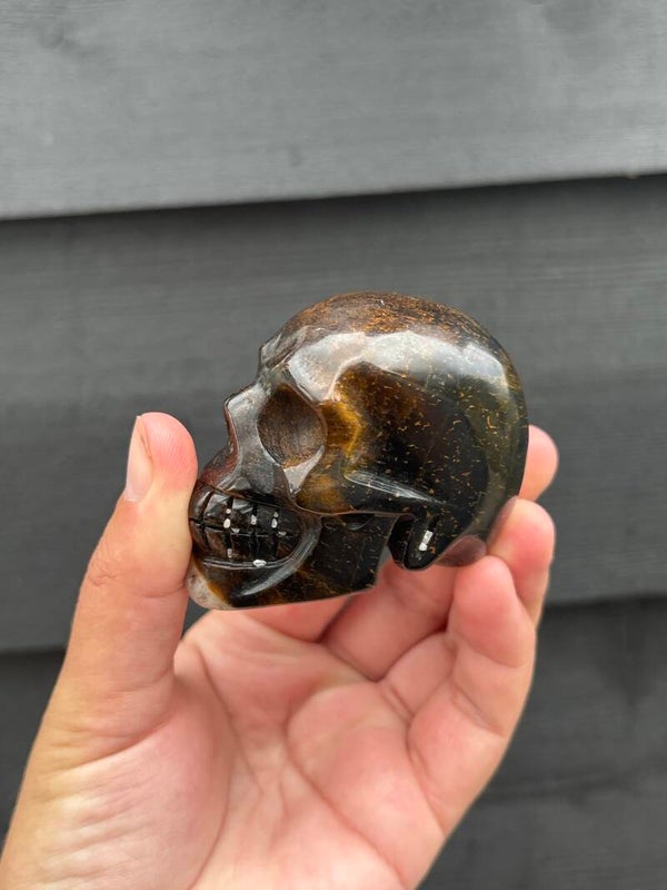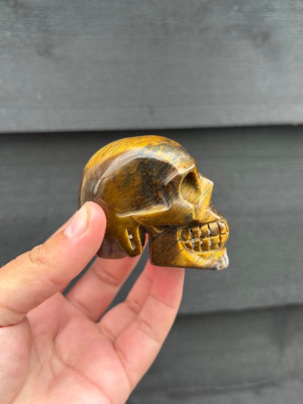 Voeg deze tijgeroog skull toe aan je collectie en laat je inspireren door de diepe symboliek van bescherming, kracht en spirituele groei die dit bijzondere object met zich meebrengt.